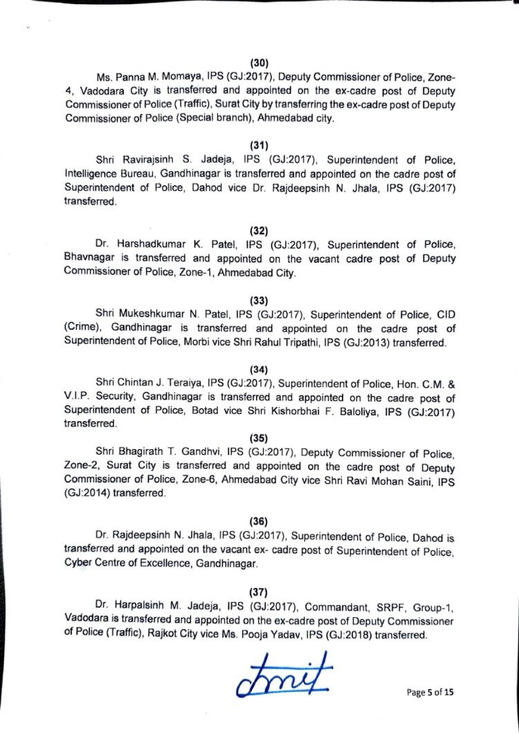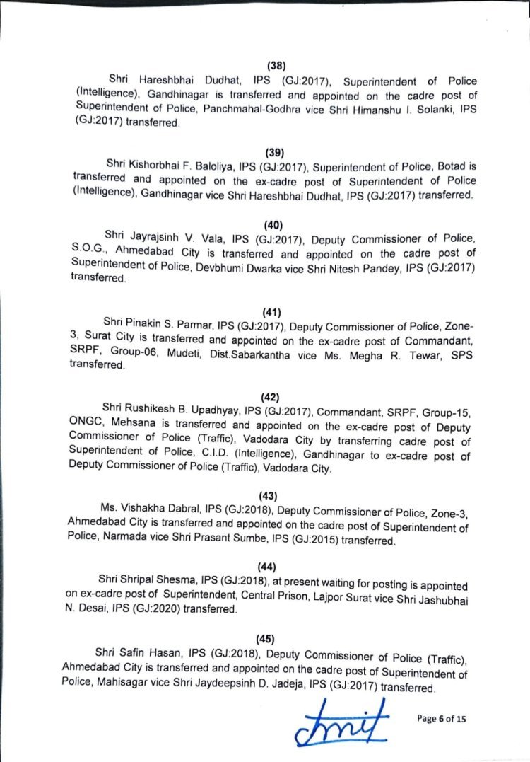 ગૃહ વિભાગે આજે જાહેર કરેલા ટ્રાન્સફર લિસ્ટમાં 105 IPSને બદલવામાં આવ્યા છે જેમાં ઉડીને આંખે વળગે તેવા ઓર્ડરમાં અમદાવાદ ટ્રાફિકના ડીસીપી સફીન હસન, અમદાવાદના ઝોન 5ના DCP બળદેવ દેસાઈ, ગીર સોમનાથ જિલ્લાના એસપી જાડેજા અને તાજેતરમાં એડિશનલ DGP અભય ચુડાસમા સામે સરકારી રિકવરીનો મોરચો ખોલનારા MT સેક્શનના SP મનીષ સીંગને બદલી નાખવામાં આવ્યા છે. આ ઉપરાંત ટ્રાન્સફરના આ મેગા ઓર્ડરમાં મોટાભાગે ગુજ્જુ અધિકારીઓને ફેરબદલ કરવામાં આવ્યા છે. બદલીના આ હુકમ વલસાડના એસપી કરણરાજ વાઘેલા, બનાસકાંઠાના એસપી અક્ષય મકવાણા, મોરબીના એસપી રાહુલ ત્રિપાઠી, પૂર્વ IPS ડી,જી.વણઝારાના ભત્રીજી મંજીતા વણઝારા વગેરેનો સમાવેશ થાય છે. DG ઓફિસમાં ફરજ બજાવતા રૂપલ સોલંકીને અમદાવાદમાં DCP ઝોન 3 તરીકે નિયુક્ત કરવામાં આવ્યા છે.