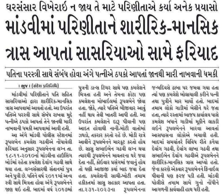 'સંદેશ' અખબારની કચ્છ એડિશનમાં આઠમી નવેમ્બર,2025ના શનિવારે પેજ નંબર 6 ઉપર આવેલા ન્યૂઝ રિપોર્ટ મુજબ, માંડવીના રૂપલબેન ગઢવીએ માંડવી પોલીસ સ્ટેશનમાં તેમના પતિ કમલેશ ગઢવી વિરુદ્ધ ફરિયાદ નોંધાવી છે. જેમાં તેમણે પતિ કમલેશ ઉપર બબ્બે લગ્નેત્તર સંબંધ હોવાની વાતનો ઉલ્લેખ કર્યો છે. તેમના પતિ કમલેશ ગઢવીની દારૂ પીવાની આદતને લઈને પણ બંને વચ્ચે ઝગડો થતો હતો. પોલીસે આ અંગે ફરિયાદ નોંધીને આગળ કાર્યવાહી કરવાનો પણ અખબારમાં ઉલ્લેખ કરવામાં આવ્યો છે. 'સંદેશ' અખબારની જેમ 'દિવ્ય ભાસ્કર'ની કચ્છ આવૃત્તિમાં પણ આ ન્યૂઝ શનિવારે પ્રસિદ્ધ થયા છે.
