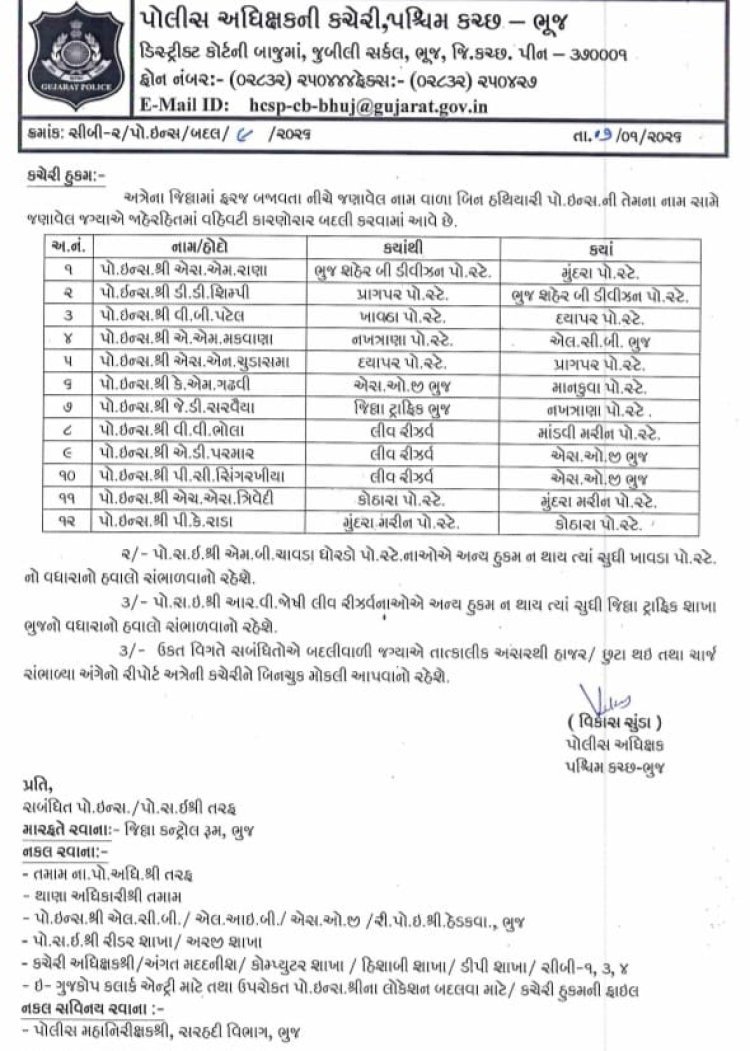 પશ્ચિમ કચ્છ પોલીસના બાર પોલીસ ઈન્સ્પેક્ટરને અરસ - પરસ ટ્રાન્સફર કરવામાં આવ્યા છે. પરંતુ બેલેન્સ કરવાની આ લ્હાયમાં એક તરફ જયાં SOGમાં એકની જગ્યાએ બે PI નું પોસ્ટિંગ કરી દેવામાં આવ્યું છે ત્યાં મારા તમારા જેવા સામાન્ય લોકોને અસર કરતી જિલ્લા ટ્રાફિક બ્રાન્ચને LCBની જેમ સબ ઈન્સ્પેક્ટરને હવાલે કરી કરી દેવામાં આવી છે.