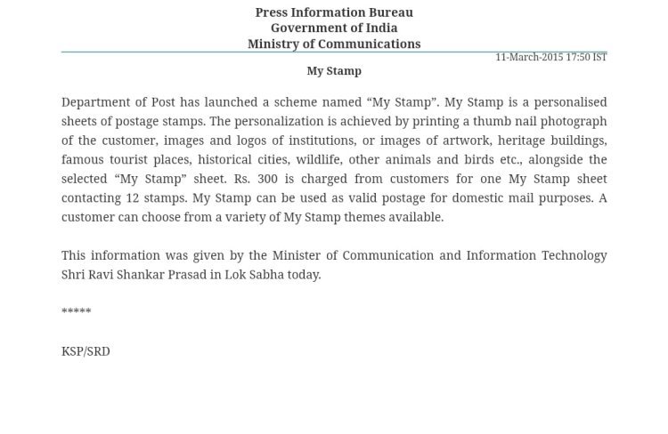 કેન્દ્ર સરકારના મિનિસ્ટ્રી ઓફ કોમ્યુનિકેશન હેઠળ આવતા ડિપાર્ટમેન્ટ ઓફ પોસ્ટ દ્વારા વર્ષ 2015માં દેશના સામાન્ય લોકોને પોતાની પોસ્ટલ ટિકિટ છપાવવાનો મોકો મળે તે માટે યોજના જાહેર કરેલી